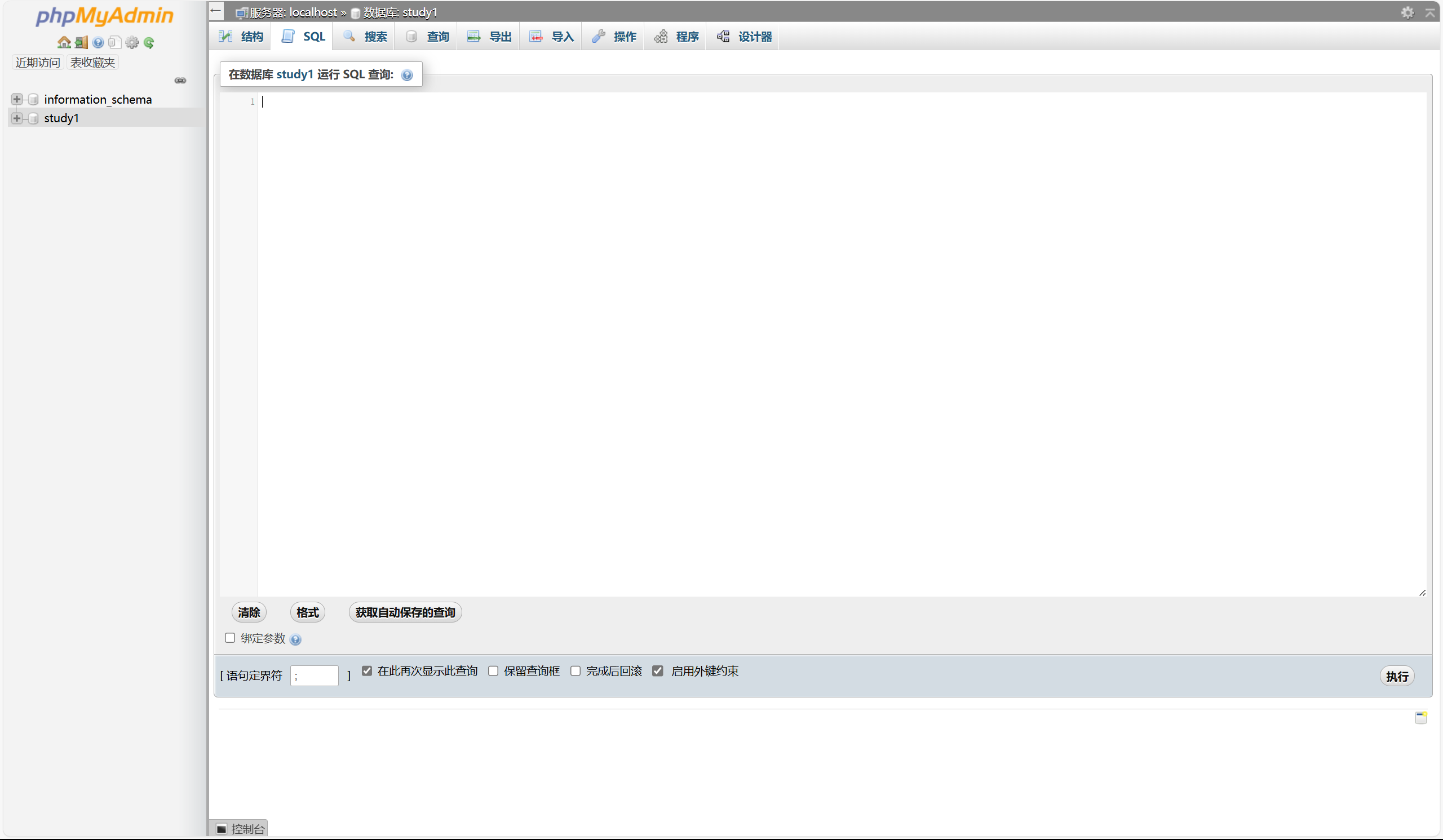 在右边的操作面板上方的菜单栏点击SQL,在下方的空白输入SQL语句