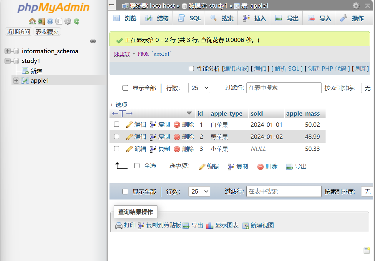 apple_mass FLOAT定义了一列存放每种苹果卖出的总质量,质量经常不是整数,所以这里为浮点型