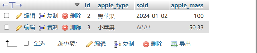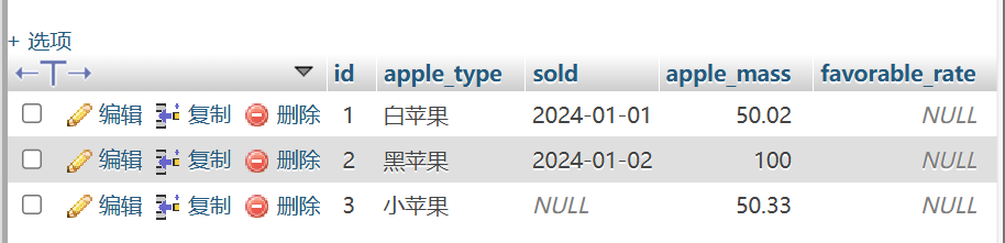 sold DATE NULL,定义了一列存放每种苹果的销售日期,是sql特有的时间类型,NULL意味着该列可以不填入数据空着,没有设置条件的时候默认为空